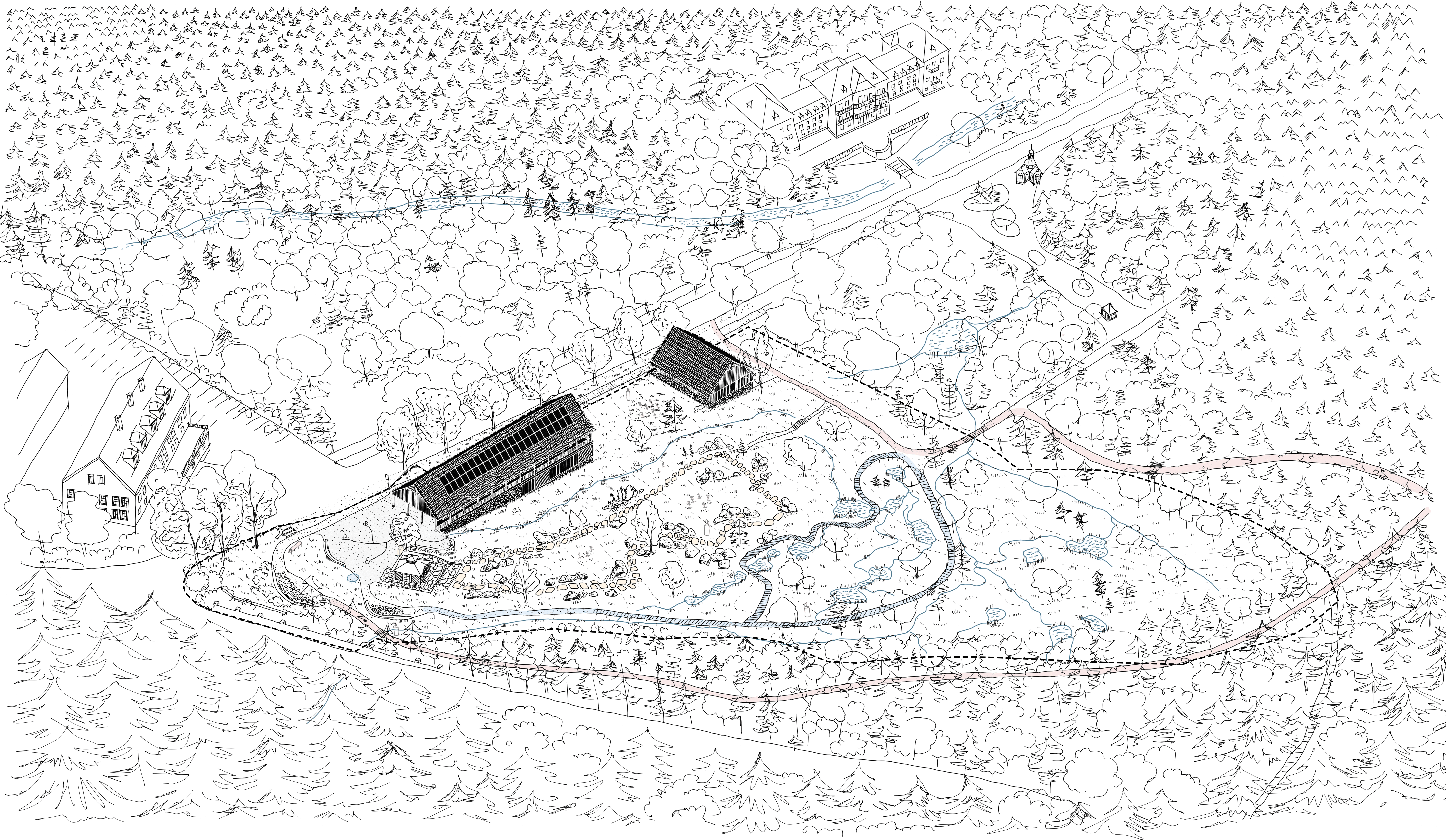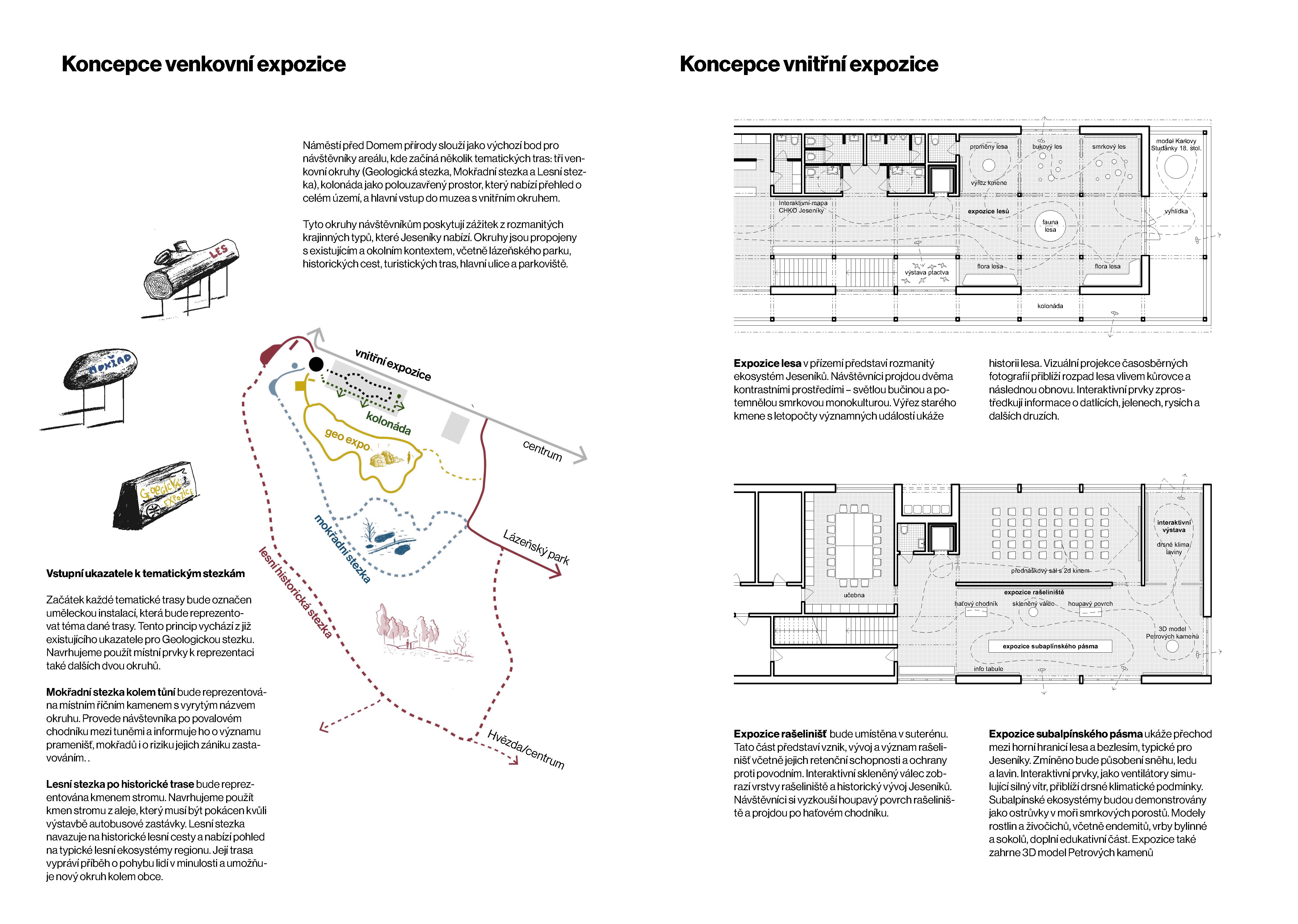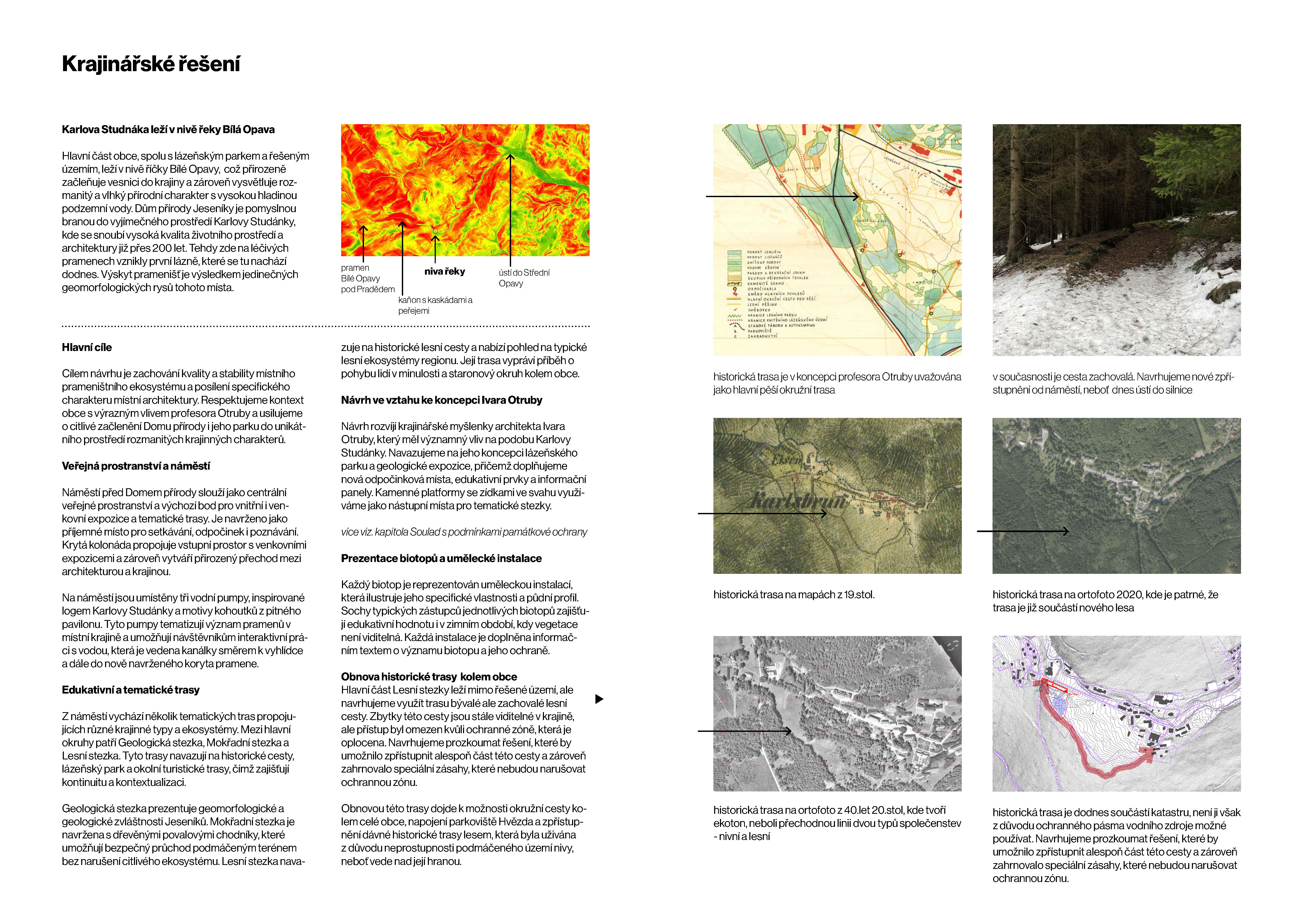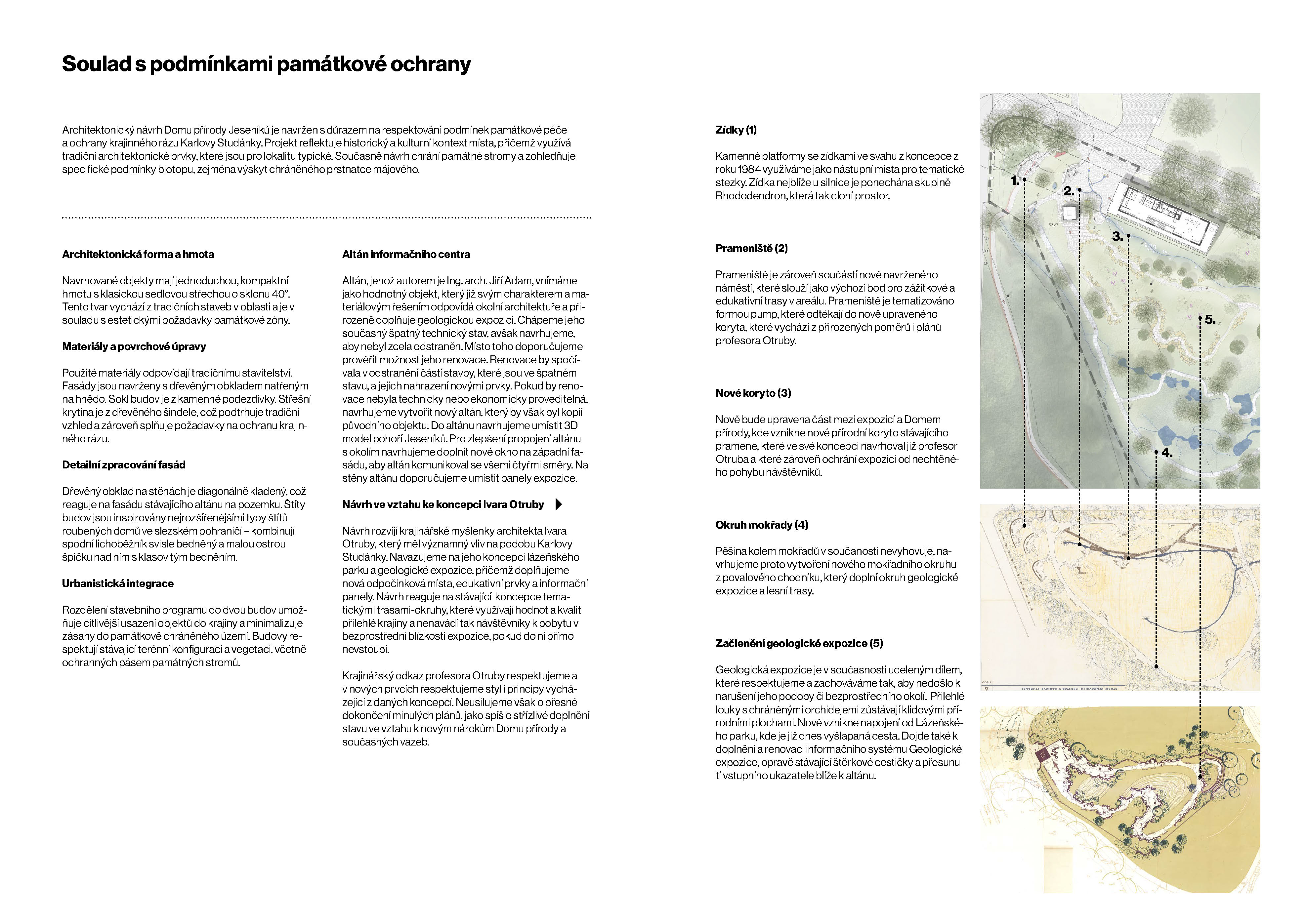 Návrh vycházel z polohy Karlovy Studánky v nivě Bílé Opavy, kde prameniště a vysoká hladina podzemní vody utvářely charakter krajiny i obce. Prostor před Domem přírody jsme navrhovali jako centrální propojení architektury a krajiny a jako výchozí bod tří tematických tras – geologické, mokřadní a lesní – navazujících na historické cesty a lázeňský park. Voda, reliéf a místní materiály byly využity jako nositelé zážitku a edukace prostřednictvím interaktivních prvků a uměleckých instalací představujících jednotlivé biotopy. Koncept tak posiloval stabilitu prameništního ekosystému a zároveň rozvíjel krajinářskou vizi Otruby.
