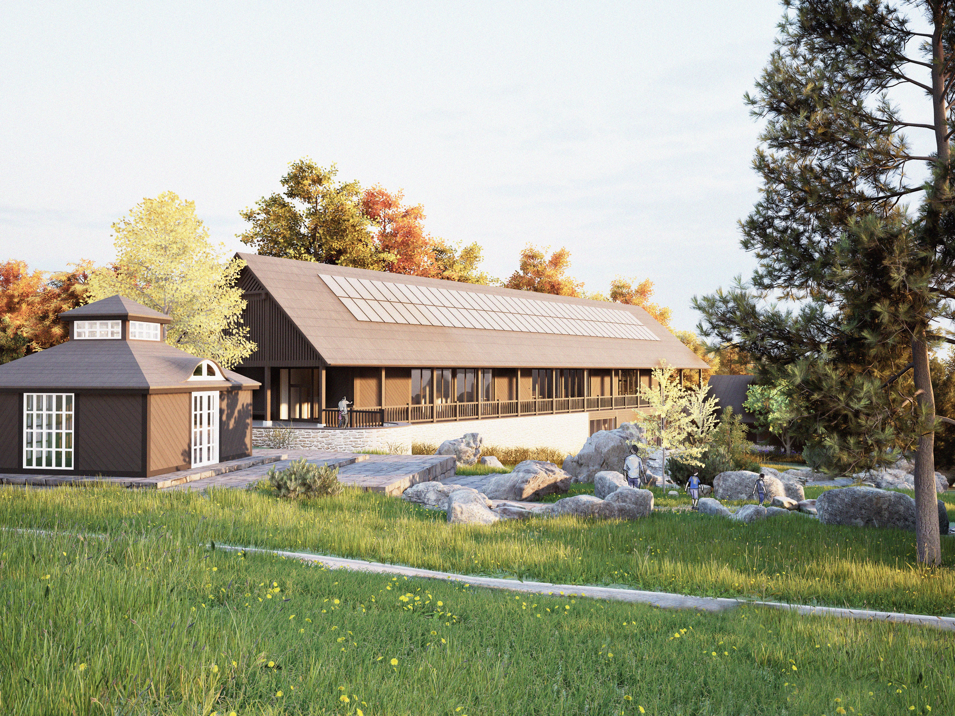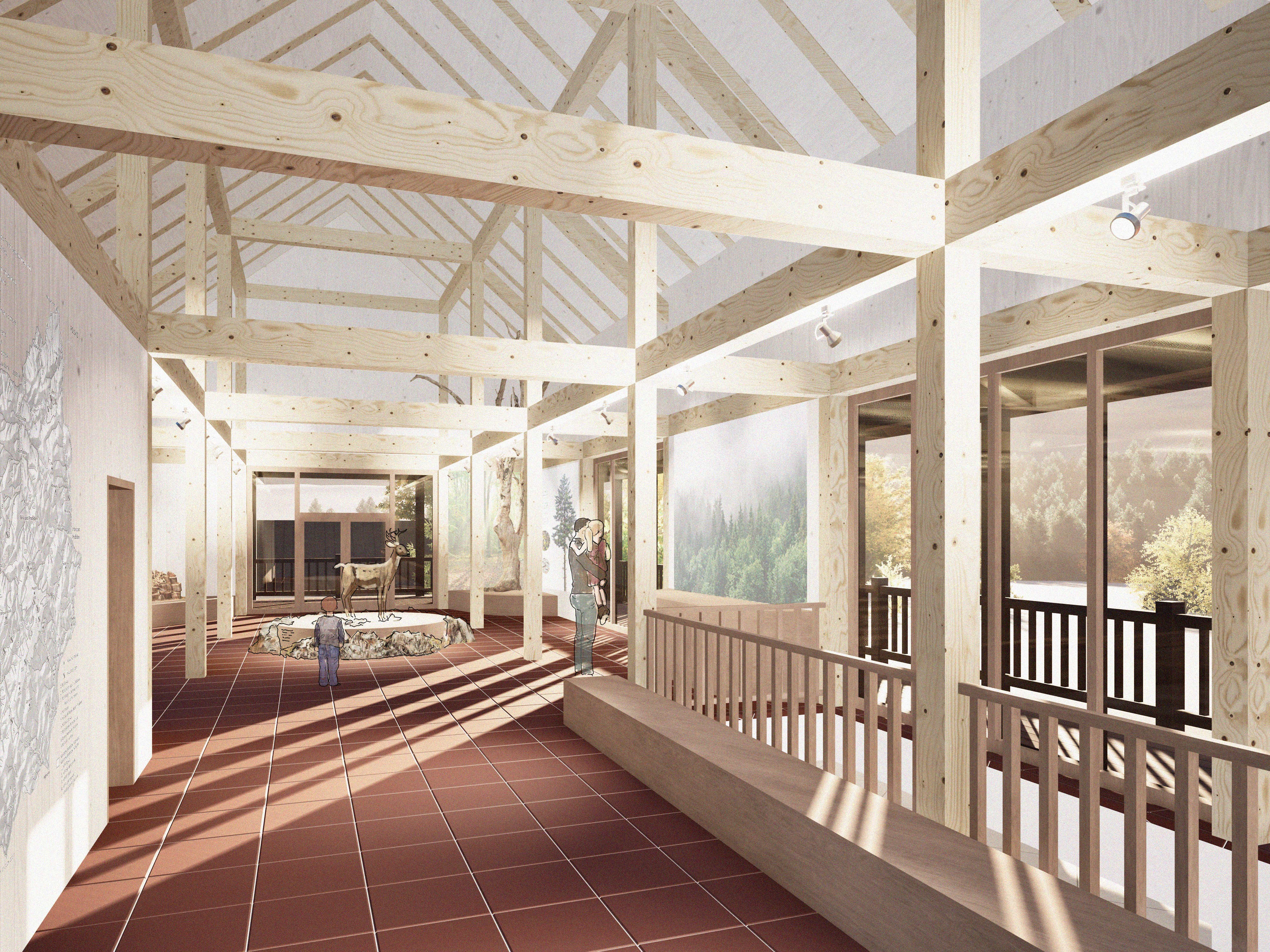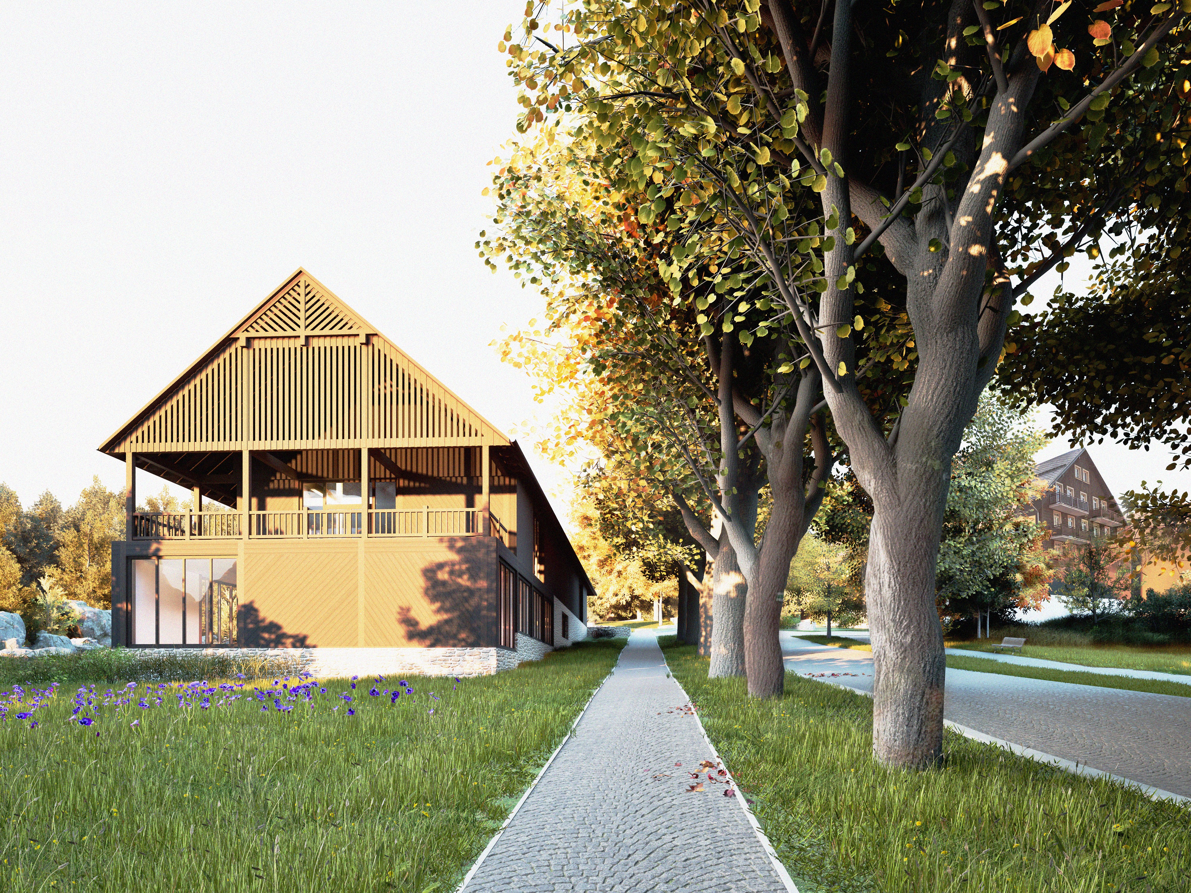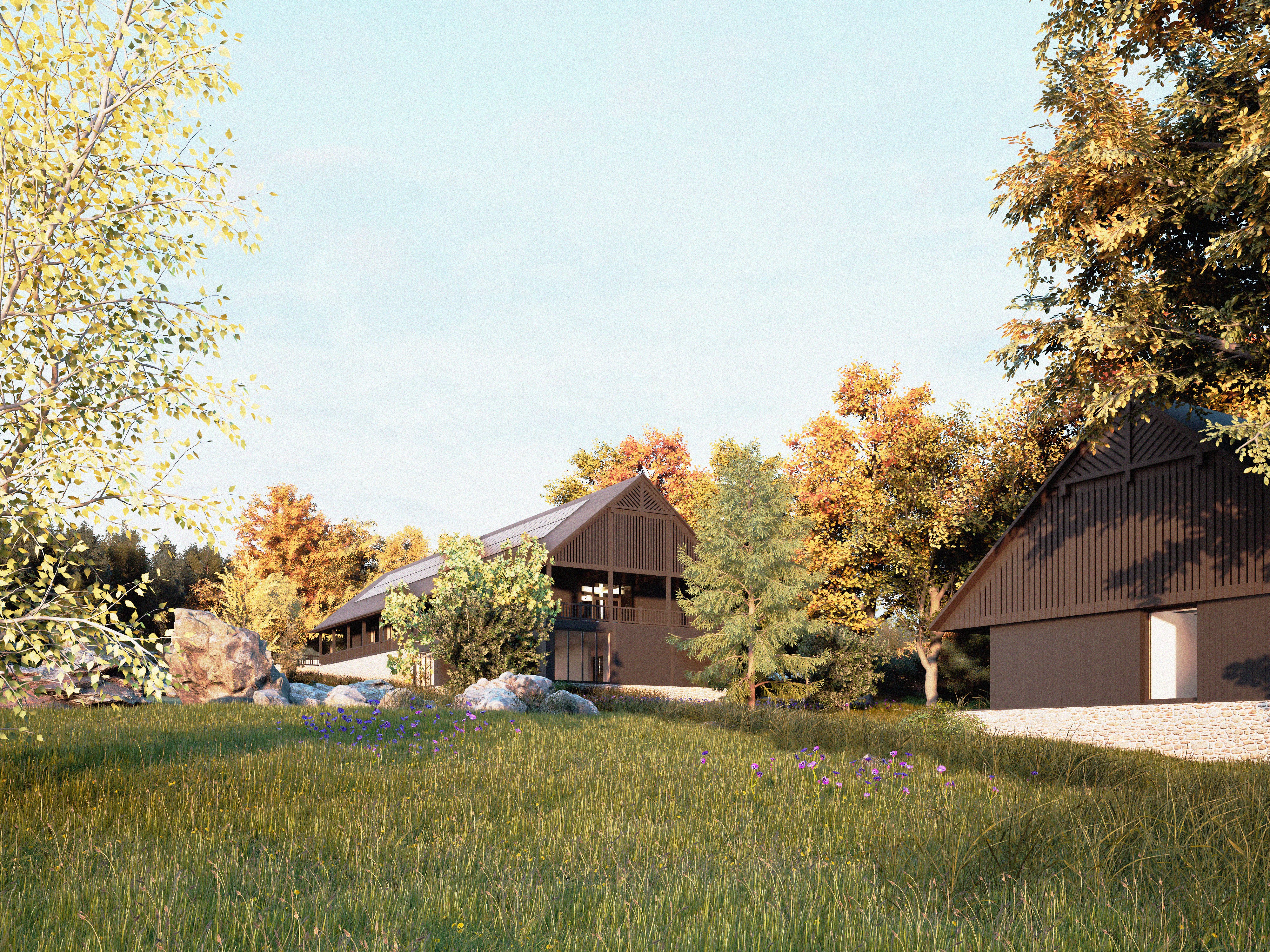 Návrh vycházel z polohy Karlovy Studánky v nivě Bílé Opavy, kde prameniště a vysoká hladina podzemní vody utvářely charakter krajiny i obce. Prostor před Domem přírody jsme navrhovali jako centrální propojení architektury a krajiny a jako výchozí bod tří tematických tras – geologické, mokřadní a lesní – navazujících na historické cesty a lázeňský park. Voda, reliéf a místní materiály byly využity jako nositelé zážitku a edukace prostřednictvím interaktivních prvků a uměleckých instalací představujících jednotlivé biotopy. Koncept tak posiloval stabilitu prameništního ekosystému a zároveň rozvíjel krajinářskou vizi Otruby.